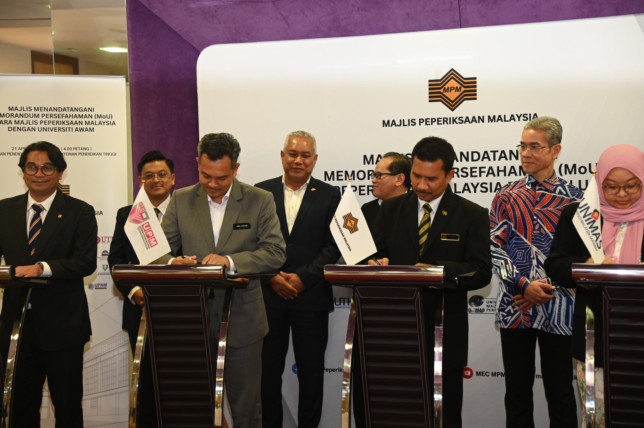 Majlis Menandatangani Memorandum Persefahaman disaksikan oleh Yang Berbahagia Datuk Dr. Anesee bin Ibrahim, Ketua Setiausaha, Kementerian Pendidikan Tinggi, Yang Berbahagia Datuk Profesor Dr. Azlinda binti Azman, Ketua Pengarah Pendidikan Tinggi, Yang Berbahagia Profesor Dato’ Dr. Md Amin bin Md Taff, Pengerusi Majlis Peperiksaan Malaysia, Yang Berbahagia Datuk Dr. Mohd Azam Bin Ahmad, Ketua Pengarah Pendidikan Malaysia, Yang Berusaha Encik Ahmad Kamal bin Haji Abdul Hadi, Timbalan Ketua Eksekutif 1 MPM dan Yang Berusaha Puan Sharifah Norsana binti Syed Abdullah, Timbalan Ketua Eksekutif 2 MPM.
